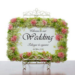 フレーム一面に広がるプリザの紫陽花ウェルカムボードがエントランスを美しく彩ります