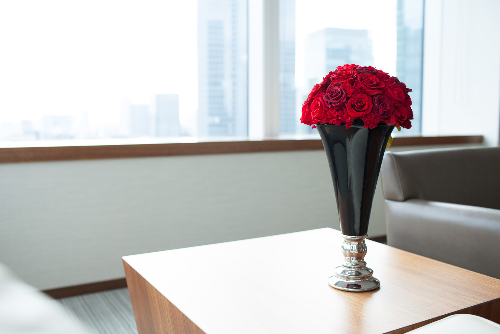 Charlotte (シャルロット)は、「華麗」というテーマでデザインした作品です。薔薇を贅沢にラウンドにし、高級感のある花器に添えています。上質さを追求していますが、無駄な装飾はできる限りなくし、シャープなデザインにまとまりました。 ゲストルームやエントランスなど来客の多い場所でこそ存在感を示しますので